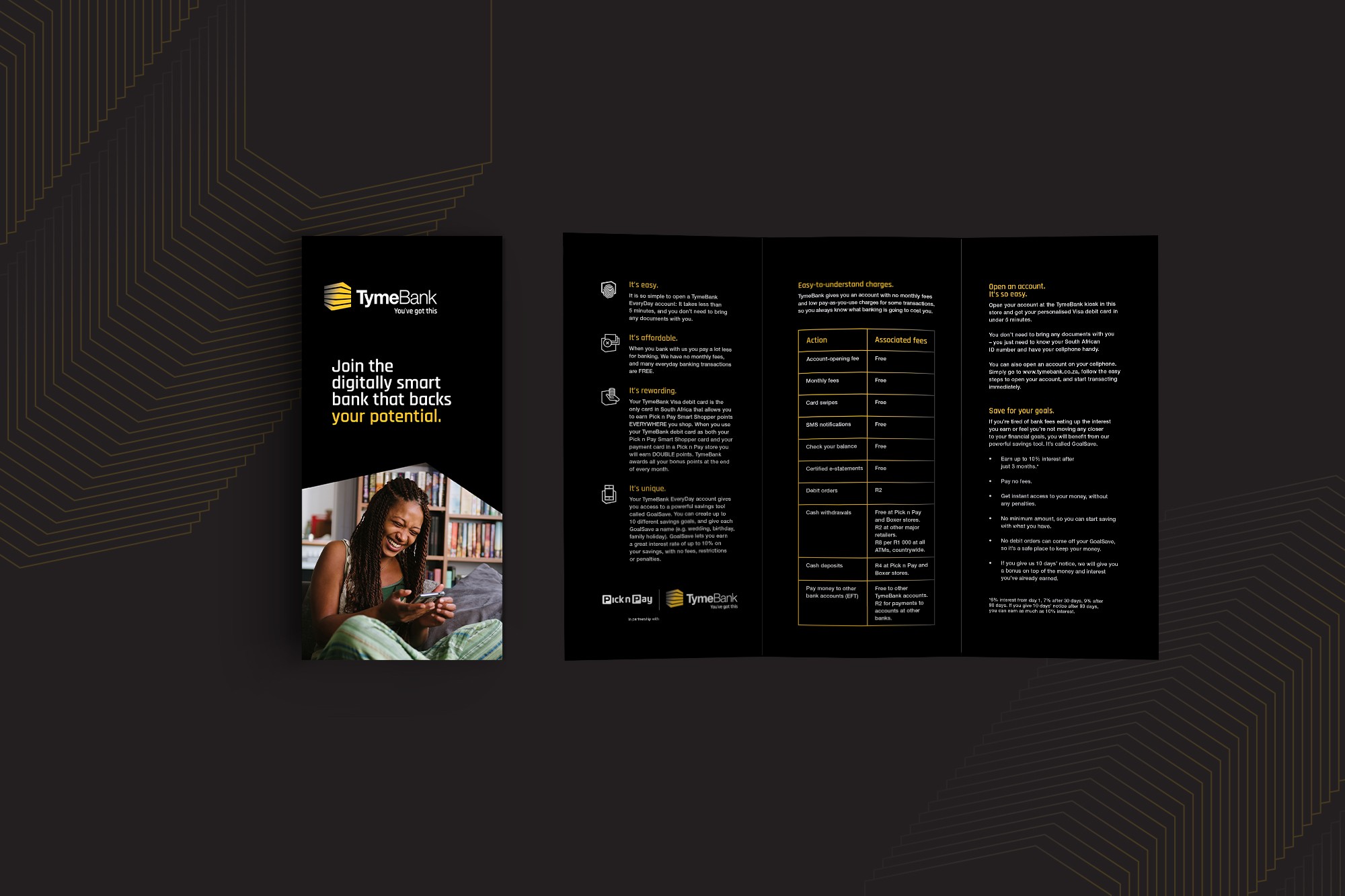 TymeBank information leaflet that accompanies the Tymebank Kiosk. One of the first touch points of the brand.
